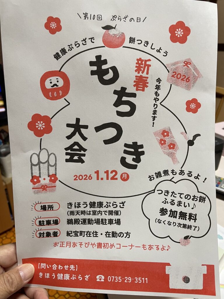 2026年1月12日(月) きほう健康ぷらざにて 初めての参加となりますが「もちつき大会」が きほう健康ぷらざで開催されました、思った以上に参加者が多く、楽しい大会でした、来年も孫たちと参加したいと思います。