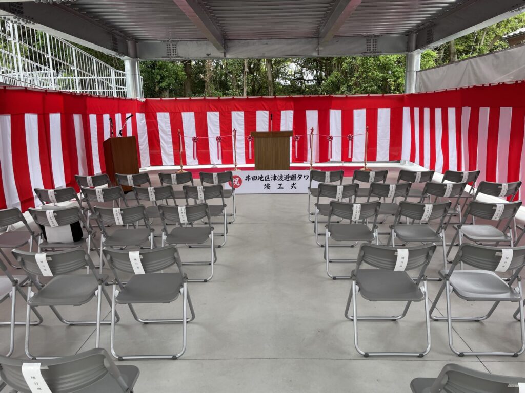 津波避難タワーは町内で 5基目、井田地区の避難タワーは海抜からの高さが 約14メートル、最大収容人数は約100人となっており、2階部分の屋内避難スペースには、収納式畳ベットや更衣室、多目的簡易便所、蓄電式コンセントなども完備されています。